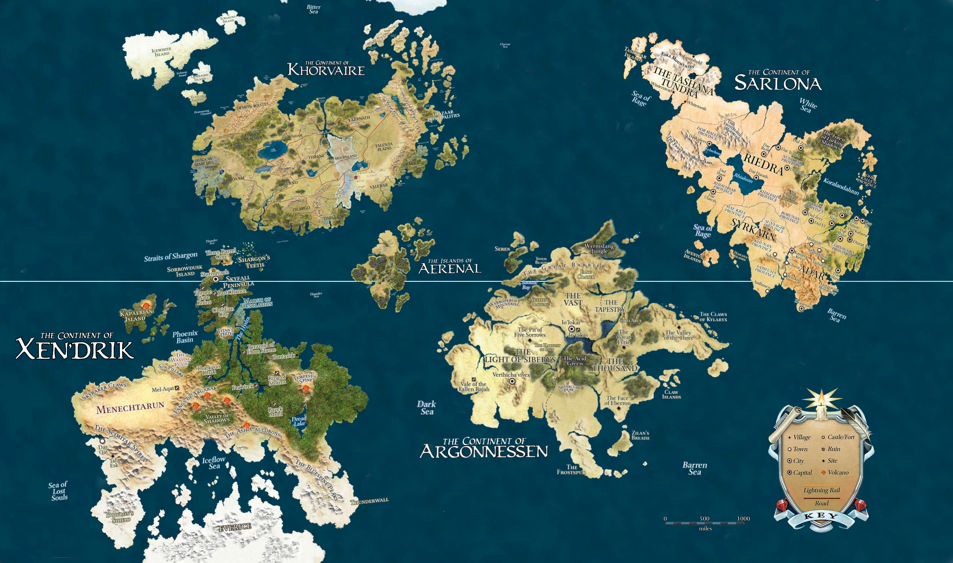 - n.b. This map leaves off the arctic and antarctic continents and some empty ocean on the far side. The arctic continent is named the Frostfell and the antarctic continent is named Everice.