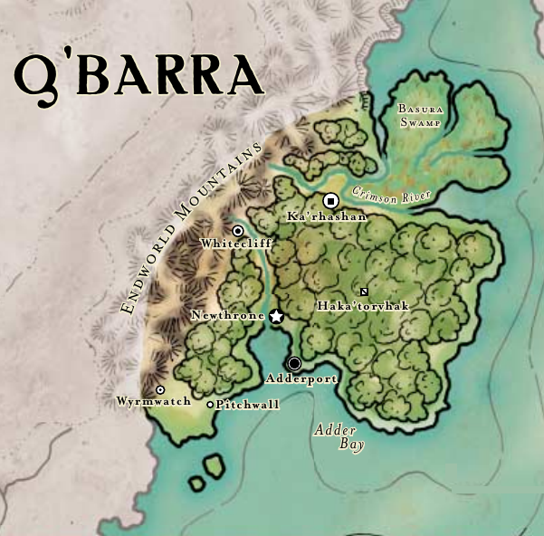Q'barra lies on the southeastern coast of Khorvaire, a broad peninsula between the Atran Isles and Valenar. Seventy years ago, idealists fleeing the collapse of Galifar settled its southwestern region, hoping to build a new nation in memory of Galifar in the snake-infested river delta. That vision survives— barely— in the settlement of Adderport, where the dream of "Galifar United" clings to life amid humid heat, biting insects, and broken promises. Not all who followed the first wave shared their ideals. Charlatans, bandits and worse saw opportunity here. It is a difficult life in Adderport for the would-be heritors of the lost kingdom.