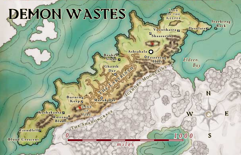The Demon Wastes lie beyond the Shadowcrag Mountains, northwest of the Eldeen Reaches, at the very edge of Khorvaire. The wastes are a cold desert, scarred and lifeless since the Age of Demons ten million years ago. In those times the surface world was ruled by fiends, loathsome creatures born from the depths of Khyber who oppressed the dragons of Eberron. The greatest among them were the Overlords— godlike archfiends. The dragons lead a war against the overlords that ended with their binding (for they could not be killed).