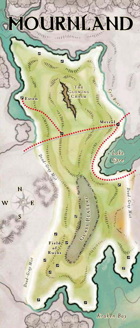 Where Cyre once shone now lies the Mournland— a blasted wasteland born 4 years ago in a cataclysm known as the Day of Mourning. Survivors speak of a terrible gray mist that swept over the nation faster than a Human could run. This same mist remains, forming a permanent shroud overhead and a miles-wide fog encircling the cursed land.